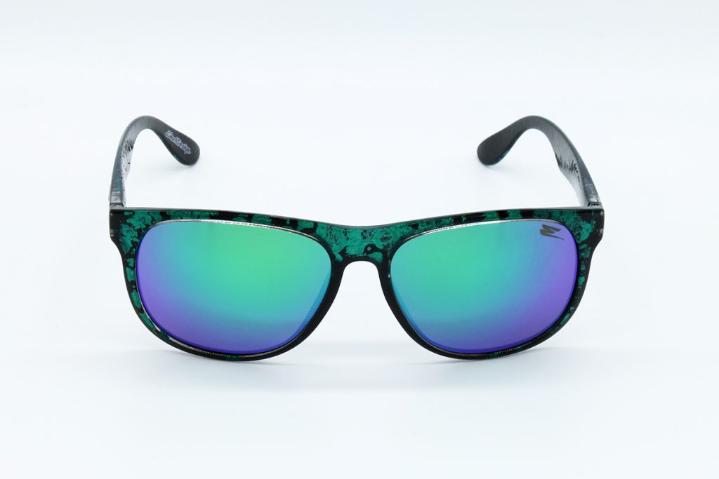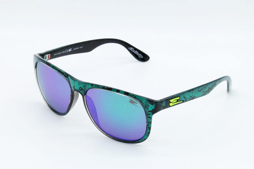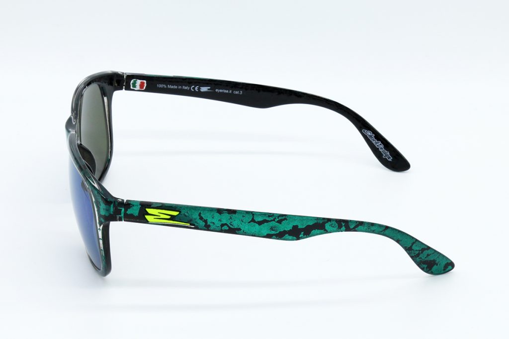 Descrizione: COLORE VERDE ESPUGNATO IN 3D, LENTE SPECCHIATA BLU, FONDO DELL’ASTA FLESSIBILE.