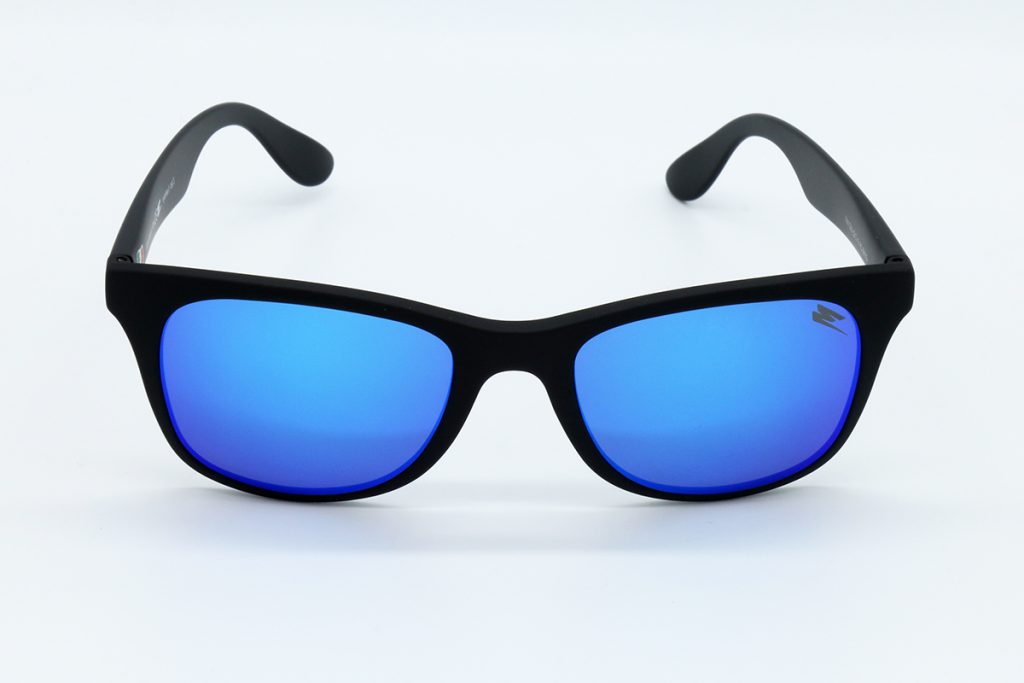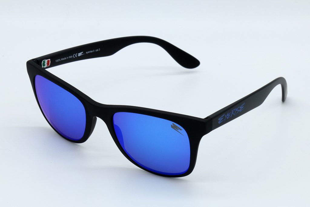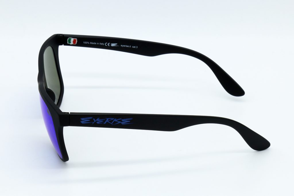 Descrizione: OCCHIALI IN GOMMA NERA CON SCRITTA EYERISE LASERATA BLU E LENTE BLU SPECCHIATA.