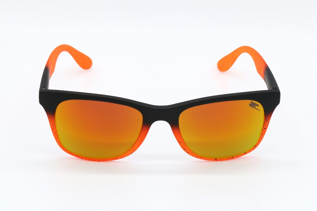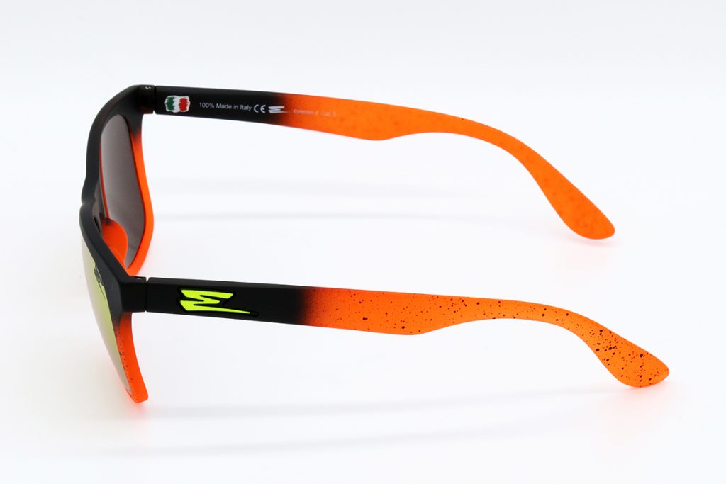 Descrizione: OCCHIALI IN GOMMA BICOLORE ARANCIO/NERO, NERO LEGGERMENTE SPRUZZATO NEL FINALE DELLE ASTE, LENTE A SPECCHIO ARANCIO.