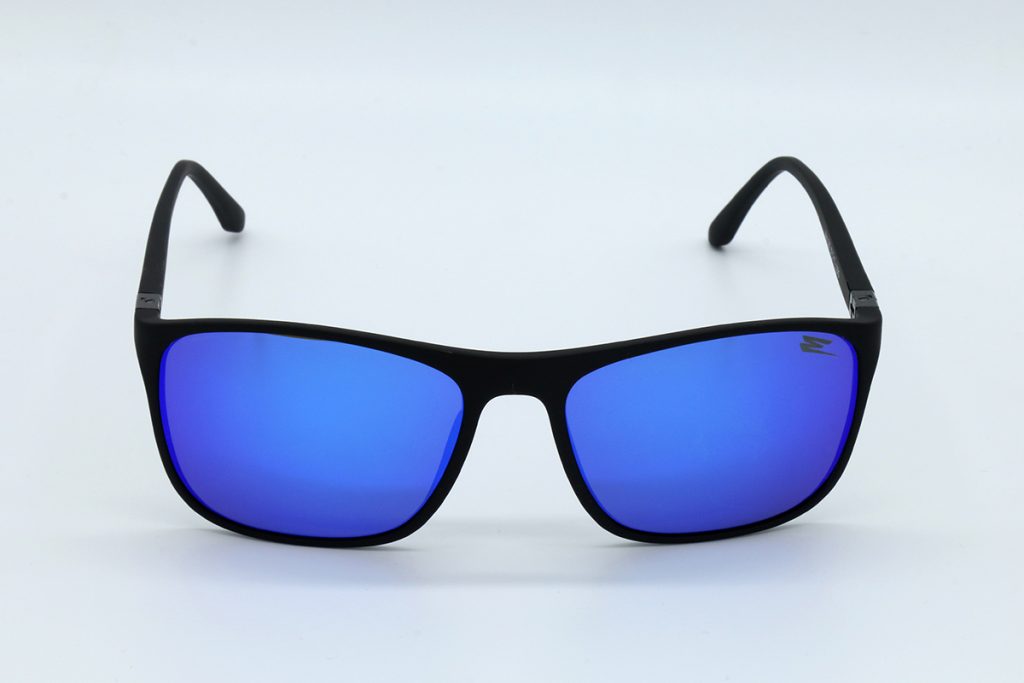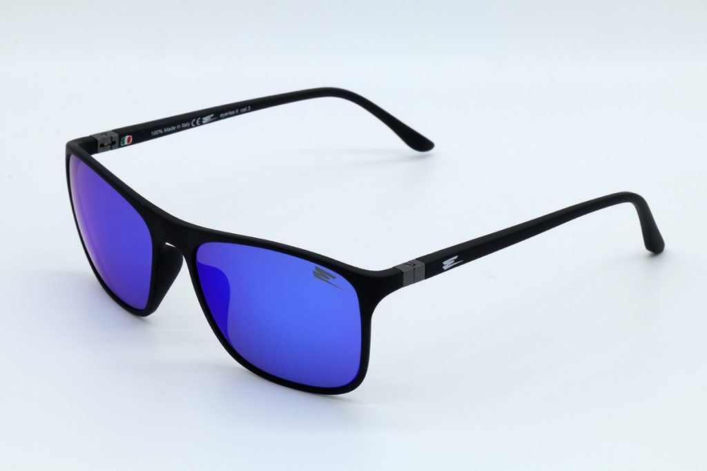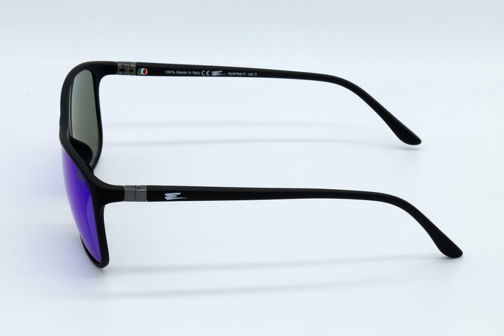Descrizione: Occhiale da sole gommato nero opaco, con aste in acciaio e lenti specchiate blu, Il logo è stampato sulle aste