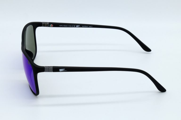 Descrizione :Occhiale gommato nero opaco, aste in acciaio con lenti specchiate blu, logo stampato.